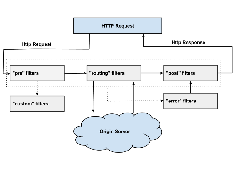- Route Filter – 요청에 대한 라우팅을 다루는 필터이다. Apache httpclient를 사용하여 정해진 Url로 보낼수 있고, Neflix Ribbon을 사용하여 동적으로 라우팅 할 수도 있다.