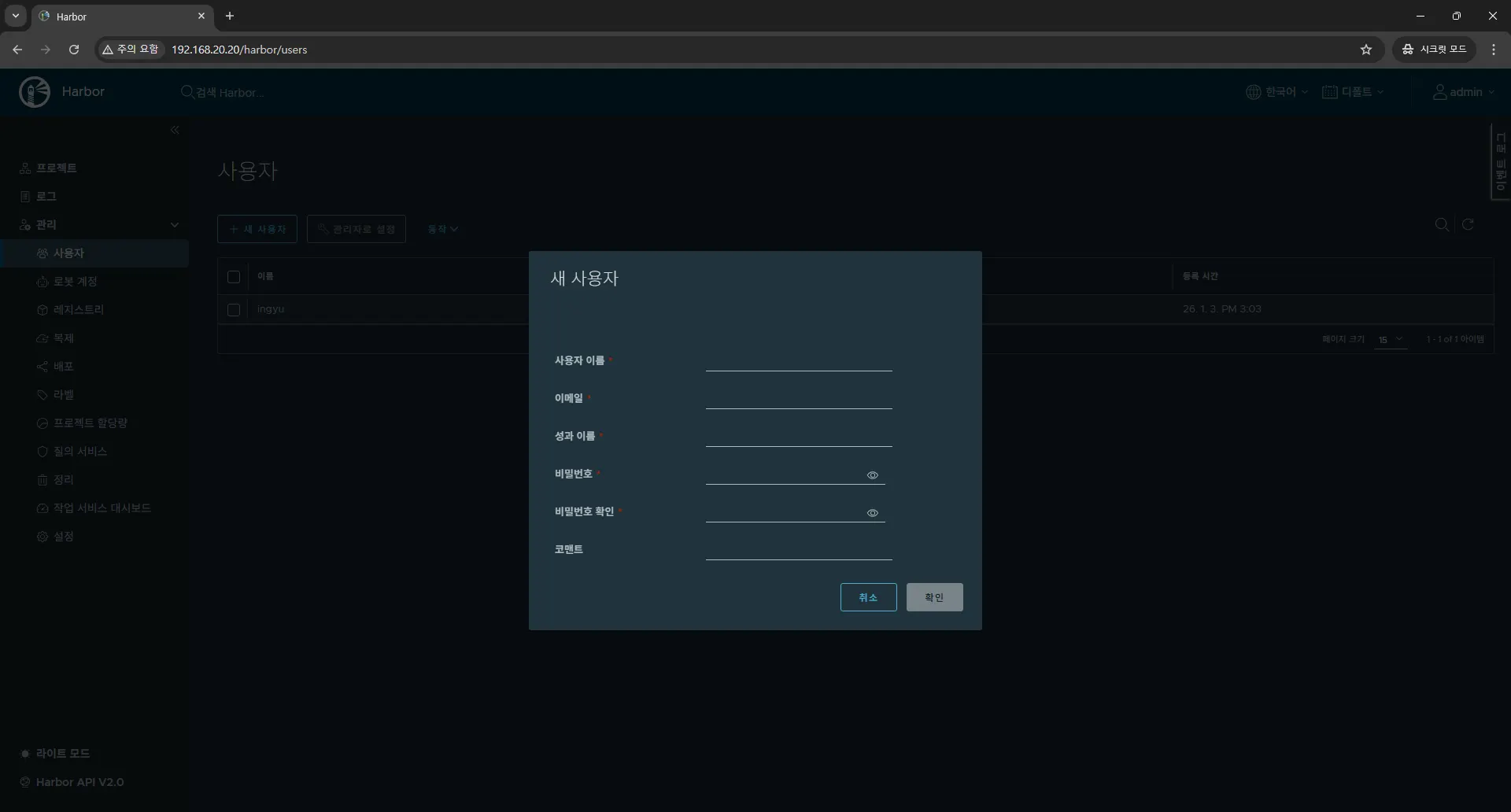 Docker Harbor 서버를 구축하면 위와 같이 Web UI를 이용할 수 있다.